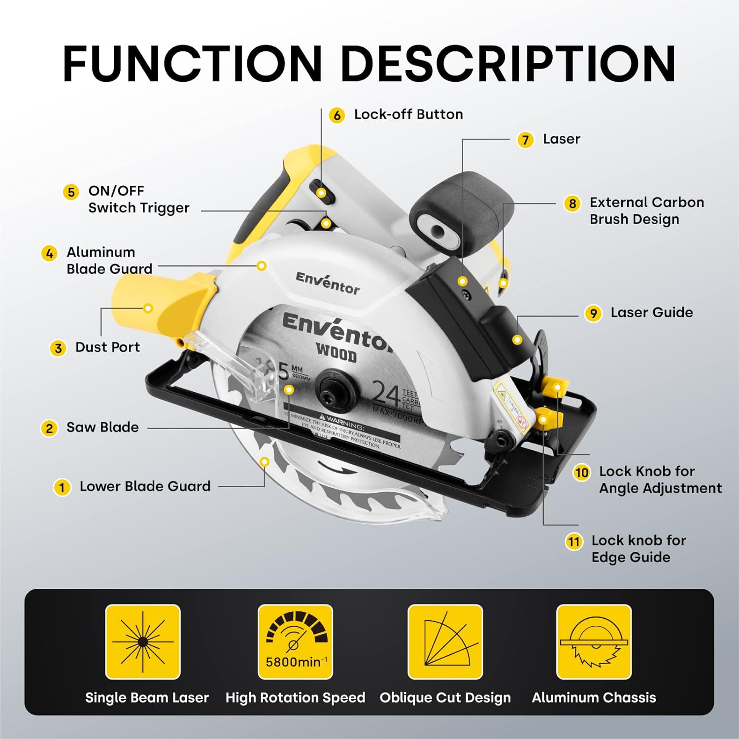 【Design Sicuro ed Ergonomico】Il pulsante di sicurezza impedisce l'apertura accidentale della macchina e garantisce operazioni di taglio più sicure. L'alloggiamento in metallo, la piastra inferiore e lo scudo migliorano la durata e la sicurezza della sega circolare. Il cavo della sega circolare da 2M è adatto al lavoro mobile e migliora il raggio d'azione.