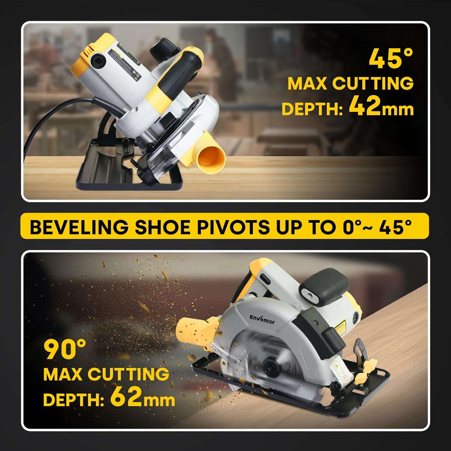 【Angolo e Profondità Regolabili】È possibile decidere liberamente l'angolo di taglio dello smusso da 0° a 45°, il design dello smusso consente di regolare il taglio a diversi angoli per un lavoro più preciso. Sarà in grado di raggiungere una profondità di 62mm a 90° e 42mm a 45°, che soddisfa la maggior parte delle esigenze di taglio.